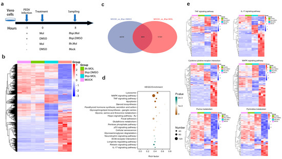 Transcriptional analysis of molnupiravir treatment. (a) Transcriptomic−experimental-treatment schematic diagram (MOI = 0.2). Mol, molnupiravir. (b) Cluster−analysis heatmap of transcription levels across all samples. The significantly and differentially expressed genes (differential expression fold | log2FoldChange | > 1, significant p-value < 0.05) between infection and mock are shown. Conditions include 8 h after infection for Vero cells with or without molnupiravir treatment. Genes were clustered using the complete method. (c) Common differential genes between mock versus 8hpi.DMSO and mock versus 8hpi.MOL groups. (d) Differential genes from groups “8hpi.DMSO vs. 8hpi.Mol” KEGG−enrichment scatter plot. (e) Heat map of the genes enriched in TNF signaling, IL-17 signaling, cytokine−cytokine receptor interaction, MAPK signaling, purine metabolism or pyrimidine metabolism.