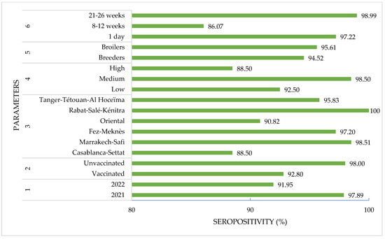 Regarding periods of collection, the prevalence of ARV specific antibodies was significantly higher in 2021 than in 2022, being, respectively, 97.9% and 91.9%. The higher seroprevalence observed in 2021 compared to 2022 can be explained by two factors: the high viral pressure in Moroccan farms due to the importation of day-old breeder chicks of broiler chickens that were likely already infected with the avian reovirus, and the shortage of vaccines. The appearance of lameness cases on the Moroccan territory in 2021 was initially thought to be due to avian reovirus infection, but the PCR results turned out to be negative. Further investigations revealed that the problem was caused by nutritional and genetic issues. These findings highlight the need for better biosecurity measures in the importation of day-old chicks, and the timely provision of sufficient vaccine stocks to prevent the spread of avian reovirus in Moroccan poultry farms [14].