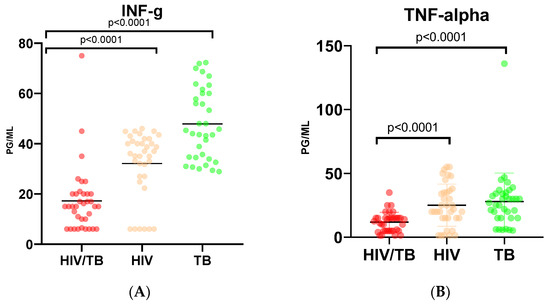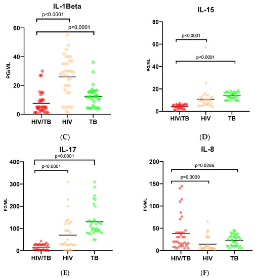 - Agarwal, S.K.; Singh, A.; Anuradha, S.; Singh, N.P.; Sokhi, J.; Baveja, U.K. Cytokine profile in human immunodeficiency virus positive patients with and without tuberculosis. J. Assoc. Physicians India 2001, 49, 799–802. Available online: https://pubmed.ncbi.nlm.nih.gov/11837467/ (accessed on 20 November 2021). [PubMed]