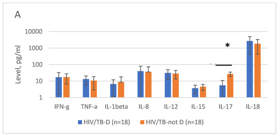 Interesting in this context is one of the rare correlations found in this study—a significant (p = 0.002) correlation of plasma levels of IL-17 and IL-15 observed in patients with HIV-1/TB coinfection, but not in either of the monoinfections. In healthy individuals, IL-15 produced by innate immune cells downregulates the production of IL-17 by T-cells [56]. Chronic autoimmune diseases, on the contrary, are characterized by a direct correlation between the levels of IL-15 and IL-17, as was shown for idiopathic inflammatory myopathies, rheumatoid arthritis (concomitant with an increase in the levels of IL-18), and multiple sclerosis [57,68,69], as well as in the wide range of autoimmune and systemic diseases associated with HIV-1 infection [70,71,72]. The concordantly reduced plasma levels of IL-17 observed here in HIV-1/TB coinfection can, thus, be interpreted as a marker of chronic inflammation. This phenomenon calls for further in-depth mechanistic studies.