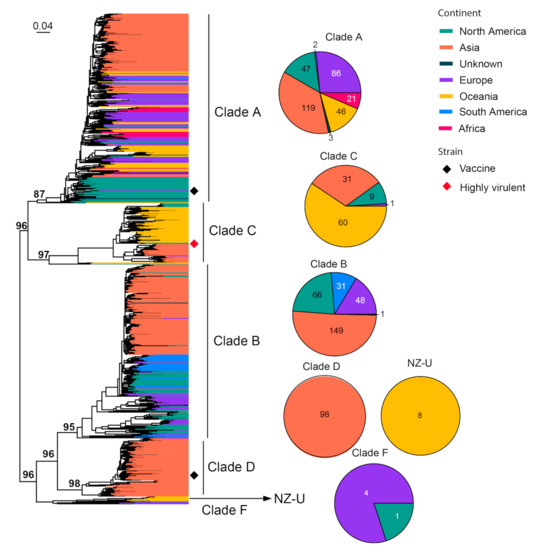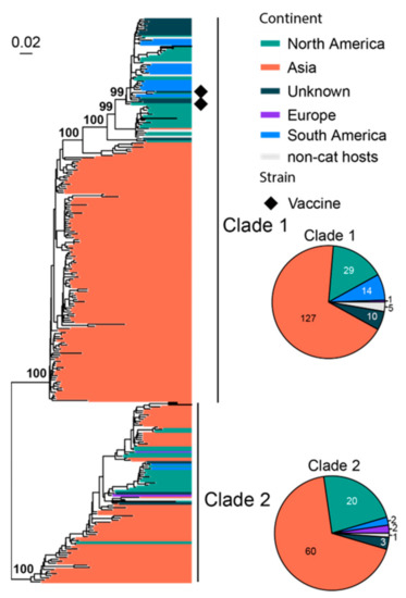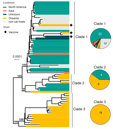 FHV-1 normally infects the upper respiratory tract of cats and causes viral rhinotracheitis [82]. We collected 66 complete genomes for phylogenetic analysis, and it revealed three major clades with strong geographic structures, although there are a few genome sequences from continents other than North America and Oceania (Figure 7). Clade 1 is comprised of mainly North American strains, Clade 3 is comprised of only Australian strains and Clade 2 is comprised of strains sampled from both continents. Three vaccine strains (i.e., Companion, Merial Purevax MLV and Feligen) were identified, and they all belong to Clade 1.