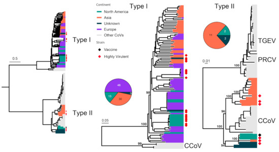 FCoV can cause two distinct types of diseases: some cause only mild (often subclinical) gastrointestinal illness, while others can lead to fatal multisystemic disease of feline infectious peritonitis (FIP) [64]. However, these diseases are not associated with specific FCoV genotypes or subtypes, and FIP arises as a result of viral mutations occurring following FCoV infection [65]. FCoVs are classified into two serotypes, Type I and Type II FCoVs [66]. We analyzed 107 complete S gene sequences (4494 nt) of FCoV in the context of 147 sequences under Alphacoronavirus 1, which includes FCoV, Canine coronavirus (CCoV), Transmissible gastroenteritis virus of swine (TGEV) and Porcine respiratory coronavirus (PRCoV) (Figure 3). Type I and II alphacoronaviruses are separated by an average of 58% nucleotide sequence divergence. FCoV is identified in both types, with the majority (92/107) of Type I and only a few (15/107) of Type II, and the latter show a relatively close relationship with Type II CCoV compared with TGEV and PRCoV (Figure 3). Highly virulent strains are identified in both Type I and II viruses, which include the HRB-17 strain from China [67], the 79–1146 strain from the USA [68] and the 26 M strain from the UK [69]. A vaccine strain is occasionally used to prevent FCoV infection, and it is derived from strain DF-2, a Type II FCoV.