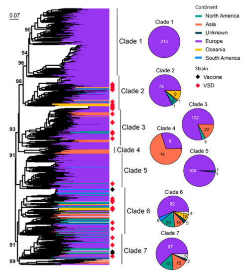 FCV commonly infects the respiratory tract of cats, and some strains with higher virulence can cause virulent systemic disease (VSD) [72,73,74,75]. A total of 801 representatives of partial viral protein 1 (VP1) genes (420 bp out of 2007 bp complete length) are used for phylogenetic analysis, which identifies seven well-supported clades (Clade 1–7) (Figure 5). Most of the diversity is dominated by sequences identified from Europe, a continent with much higher overall sequence numbers (644/801) and diversity than the rest of the continents. Interestingly, Clades 2, 3, 6 and 7 are all “cosmopolitan” with geographic expansion into more than three different continents. These clades are also ones that contain more strains with higher virulence and transmissibility than the rest of the clades (Figure 5). Specifically, Outbreak NSW 2015 [76], Outbreak ACT 2018 [76] and Outbreak Massachusetts 2001 [77] were from Clade 2, whereas Outbreak QLD 2017 [76], Outbreak Missouri 1995–1996 [77], Outbreak Sacramento 1998 [78], Outbreak Harrisburg 2003 [78] and Outbreak Florida 2003 [78] were from Clade 6 (Figure S1). Four vaccine strains are identified here, which belong to Clade 6 (FCV-F9) and Clade 7 (F4, FCV-255 and FCV-2024).
