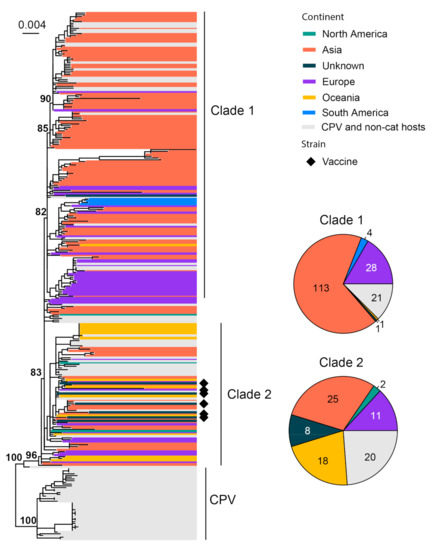 FPV is known as an important pathogen that causes gastrointestinal disease in cats [79]. This disease is also referred to as feline panleukopenia or feline infectious enteritis, which can result in severe or even fatal disease in kittens. We used 252 representatives of the complete minor capsid protein (VP2) gene (1755 bp) of FPV for phylogenetic analysis. All FPVs form a sister clade to canine parvovirus (CPV). Within FPV, the diversity can be divided, with low confidence, into two major clades and a number of small transmission chains close to a common ancestor of all FPVs (Figure 6). Asian strains dominate the entire phylogeny (144/252), followed by Europe (42/252) and Australia (19/252). Interestingly, FPV also contains a number of strains identified from non-cat feline hosts, such as the fox, lion, dog and raccoons, amongst others, resulting in gastroenteritis- and leukopenia-type diseases similar to those observed in cats [79,80]. Six vaccine strains (FPV-Felocell, FPV-Panocell, Philips Roxane, FPV-Purevax, PLI-IV and FPV-Dohyvac) are identified within Clade 2 (Figure 6). The outbreak strains, which were recorded in Outbreak Mildura 2015, Outbreak Sydney 2016–2017 and Outbreak New Zealand 2016 [81], are also located within Clade 2 (Figure S2).