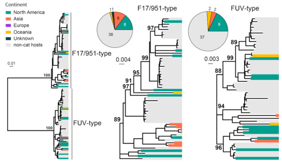 FFV is generally considered to be non-pathogenic in domestic and wild felids [15]. FFVs are classified into two subtypes, the F17/951-type and FUV-type [83]. We collected 104 env gene (2949 bp) sequences of FFV for phylogenetic analysis. FFV strains can be divided into two subtypes, including F17/951-type and FUV-type (Figure 8). Interestingly, the majority of the sequences obtained here were from cougars sampled from the United States [84]. Among the cat-associated FFV, the majority of the viral sequences are obtained from North America and Asia, although the sampling size is too small for reliable phylogeographical inference.