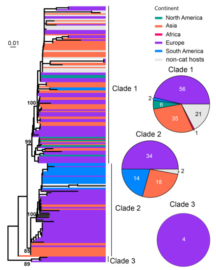 FeMV is believed to be associated with renal disease, although more data from clinical studies are required to confirm this [38,85]. Previous analysis of FeMV genomes divided the diversity into two genotypic lineages, FeMV−1 and FeMV−2 [86]. In our study, a total of 186 sequences of RdRp gene sequences were analyzed, which divided the diversity into at least three clades (Figure 9). Among these, Clade 1 has cosmopolitan distribution except for Australia, Clade 2 is mainly found in Europe, South America and Asia, and Clade 3 had only four sequences which were all from Europe (Figure 9).