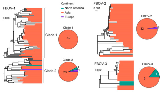 Diversity and phylogeographic structure of FBoVs based on NS1 gene. Three maximum-likelihood trees reconstructed based on complete NS1 gene alignments (2415 nt, 2394 nt and 2391 nt) are shown, which include 74, 33 and 7 virus sequences obtained from the GenBank, respectively. The trees are mid-point rooted. Geographic locations (continent) for these virus strains are marked with different colors. The detailed geographic distributions of each subtype are shown as pie charts on the right of the phylogenetic trees.