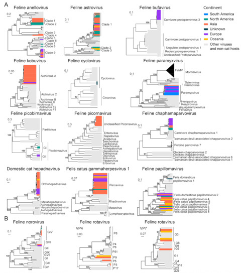 Diversity and phylogeographic structure of other feline viruses based on their marker genes/proteins. (A) Interspecific phylogenetic trees and (B) intraspecific phylogenetics were reconstructed for less characterized cat virus species. The trees are mid-point rooted. The virus species’ name is labeled on the top of each tree. Geographic locations (continent) for these virus strains are marked with different colors.