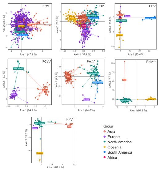 Phylogeographic structures were examined for a few feline virus species with relatively large sample sizes, namely, FCV, FIV, FPV, FCoV, FeLV, FHV-1 and FFV. Based on Wilk’s lambda, all seven viruses examined here had significant geographic structure (p < 0.001), although the degree of such structuring varied between different virus species (Table 1). Indeed, the differentiation of geographic groups is most obvious for FCoV, FeLV, FHV-1 and FFV but least obvious for FCV (Table 1). Similarly, DAPC scatter plots reveal clear geographic structure for all viruses examined except for FCV, which shows substantial mixing of virus diversity from different continents (Figure 12). In addition to FCV, there are also clear indications within other viral species where strains from different continents are indistinguishable (i.e., the mixing of North and South American strains in FIV and European and Asian strains in FPV) (Figure 12), suggesting cross-continent transmissions of the corresponding pathogens.