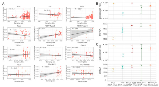 Evolutionary analysis. (A) Regression of root-to-tip genetic distance against the year of sampling for several feline viruses. Black indicates a linear regression line. (B) Estimates of evolutionary parameters (substitution rate and tMRCA) for feline viruses via TreeTime software (version 0.8.6). (C) Estimates of evolutionary parameters (substitution rate and tMRCA) for feline viruses via LSD software (version 0.3beta).