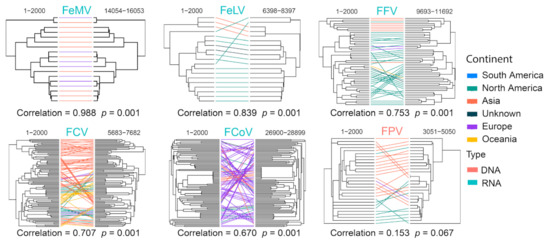 We assessed recombination frequencies for different viral species by comparing phylogenies reconstructed based on the first and last 2000 bp of the full-length genomes, which included FCV, FCoV, FFV, FPV, FeLV and FeMV. Correlation coefficiency estimations based on patristic distances (i.e., genetic distance derived from the maximum likelihood phylogenetic trees) revealed relatively greater phylogenetic incongruence for FPV, FCoV, FCV and FFV (Pearson’s coefficient < 0.8) and therefore higher recombination rates for these viruses (Figure 14). Strikingly, the coefficient for FPV was as low as 0.153 (p = 0.067), suggesting extremely frequent genomic exchange between diverse FPV genomes. Similarly, low recombination rates were inferred for FeMV and FeLV, which had highly congruent phylogenetic structures between the 5′ and 3′ ends of their genomes (i.e., coefficient > 0.8) (Figure 14).