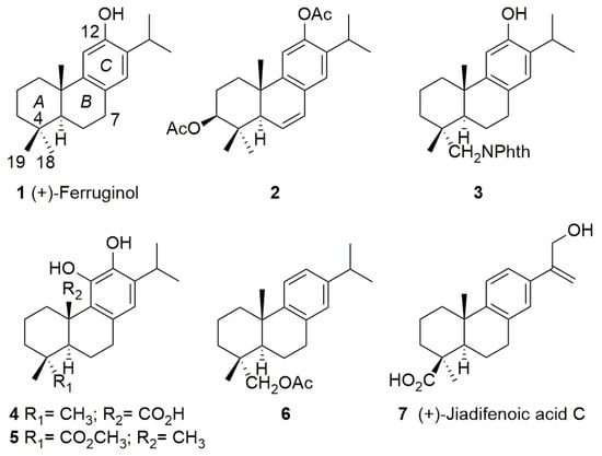 The abietane-type diterpenoids are naturally occurring compounds isolated from plants of different families such as Araucariaceae, Cupressaceae, Phyllocladaceae, Pinaceae, Podocarpaceae, Asteraceae, Celastraceae, Hydrocharitaceae, and Lamiaceae [11]. These metabolites show an extensive range of promising pharmacological activities, including antimicrobial properties [11]. Several semisynthetic derivatives have also displayed interesting pharmacological properties [12]. For example, natural (+)-ferruginol (1) and diacetate (2) (3β,12-diacetoxyabieta-6,8,11,13-tetraene) have shown important anti-SARS-CoV activities with a high cytopathogenic effect (CPE) reduction and effective replication inhibition (SARS-CoV, EC50 = 1.39 and 1.57 μM, respectively, in Vero E6 cells) [13]. Wen et al. (2007) [13] found that ferruginol (1) did not show inhibition for SARS-CoV 3CL protease (3CLpro), a key target for antiviral drug design, below 100 μM; later, other researchers reported significantly better inhibitory effects on 3CLpro (IC50 = 49.6 μM) [14]. Additionally, the semisynthetic phthalimide ferruginol analogue 3 (Figure 1) has shown anti-dengue and anti-herpes properties [15], and anti-Zika activity against Brazilian strains [16] as well as anti-Zika and anti-chikungunya activities against Colombian strains [17]. Carnosic acid (4) has displayed inhibitory effects on human immunodeficiency virus 1 (HIV-1) protease and HIV-1 virus [18], and on human respiratory syncytial virus replication [19]. Its semisynthetic analogue 5, however, demonstrated a better anti-herpes profile than carnosic acid itself [20]. Semisynthetic dehydroabietinol acetate (6) showed mild anti-herpes activity [21]. In recent years, several C19-functionalized abietane-type acids, i.e., jiadifenoic acid C (7), and its derivatives isolated from Illiciaceae plants (jiadifenoic acids from the roots of Illicium jiadifengpi) have exhibited important anti-Coxsackie virus B activities [22].