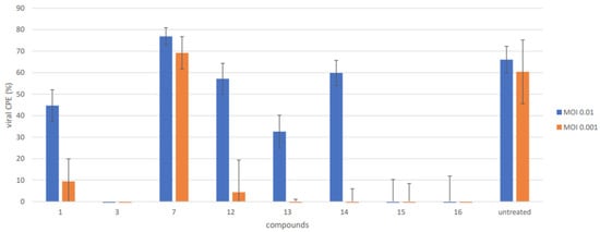 The antiviral activity of the compounds was evaluated using the reduction in the viral titer and the reduction in the virus-induced cytopathogenic effect (CPE), characterized mostly by extensive host cell death and degradation of the cell monolayer.