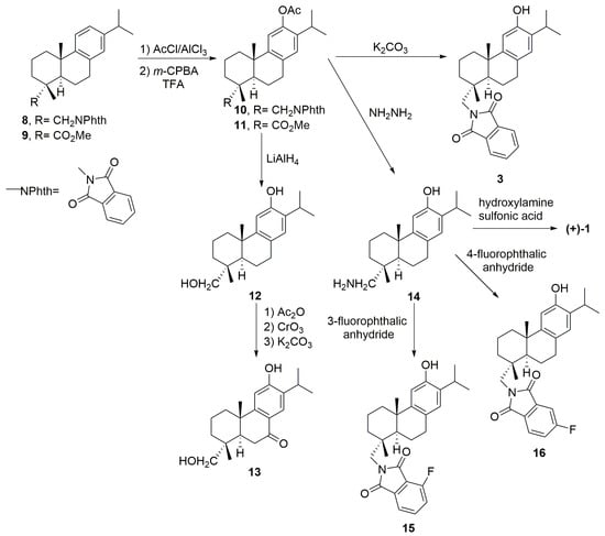 The tested compounds 1, 3 and 12–14 are known and were obtained following synthetic routes previously reported, as follows (see above Scheme 1): compounds 1 and 3 following our recently optimized conditions [17] through intermediate 10; meanwhile compounds 12 and 13 where obtained from intermediate 11 [24]; for the synthesis of compound 14 (12-hydroxydehydroabietylamine) we optimized our previous work [23] starting from 10, changing slightly the protocol to achieve a better yield. Compound 14 was the intermediate for novel compounds 15 and 16. In particular, compounds 1, 3 and 14–16 were obtained from commercially available (+)-dehydroabietylamine, which by condensation with phthalic anhydride gives phthalimide 8 [17,25]. To make the C-12 phenolic moiety Friedel–Crafts and Baeyer–Villiger reactions were used (Scheme 1). Thus, Friedel–Crafts acylation of 8 followed by Baeyer–Villiger oxidation gave acetate 10 [25], which by mild basic methanolysis afforded ferruginol analogue 3 named 18-(phthalimid-2-yl) ferruginol [17]. By contrast, the treatment with hydrazine of compound 10 furnished phenol-amine 14 which served as an intermediate for the synthesis of (+)-ferruginol (1), by deamination [23], and fluorinated phthalimides 15 and 16 by condensation with either 3-fluorophthalic anhydride or 4-fluorophthalic anhydride, respectively. Similarly, starting from methyl dehydroabietate (9) [21], prepared from (−)-abietic acid by esterification and aromatization with Pd/C catalyst, followed by Friedel–Crafts reaction and Baeyer–Villiger oxidation, gave acetate 11 which was first converted into alcohol 12 by reduction with LiAlH4, and then into keto-alcohol 13 in a three-step sequence [24].