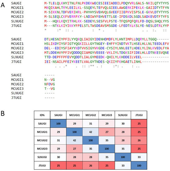 Sequences generated from the SAUGI PSI-BLAST search with >80% query cover, and the sequences generated from the Ugi PSI-BLAST search were aligned using Clustal Omega [