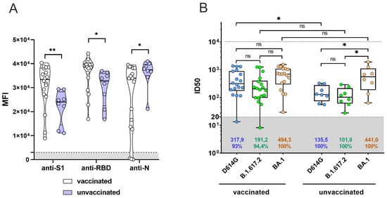 - Glöckner, S.; Hornung, F.; Baier, M.; Weis, S.; Pletz, M.W.; Deinhardt-Emmer, S.; Löffler, B.; the CoNAN Study Group. Robust Neutralizing Antibody Levels Detected after Either SARS-CoV-2 Vaccination or One Year after Infection. Viruses 2021, 13, 2003. [Google Scholar] [CrossRef]