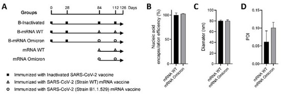 Immunization schedule and characterization of the mRNA vaccines. (A) Illustrated immunization schedules of the groups. The solid box, hollow triangle, and hollow circle represent immunization with the inactivated SARS-CoV-2 vaccine (KEWEIFUTM) and mRNA vaccines encoding the S protein of the WT and B1.1.529 strains, respectively. (B) The nucleic acid encapsulation efficiency of mRNA-LNP vaccines. (C,D), The diameter and polydispersity index (PDI) of mRNA-LNP vaccines were measured by a Zetasizer Nano ZS particle size analyzer, and each test was repeated three times.