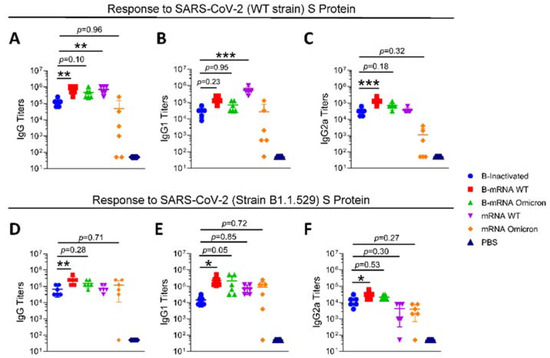 Antibody titers detected by enzyme-linked immunosorbent assay (ELISA). S proteins of the WT strain (A–C) and B1.1.529 strain (D–F) were precoated onto microplates, and the IgG (A,D), IgG1 (B,E), and IgG2a (C,F) levels in sera from different groups were measured. N = 6, points represent individual mice. Data were compared using one-way analysis of variance followed by Dunnett’s multiple comparisons tests, with the inactivated group as the control. * p < 0.05, ** p < 0.01, *** p < 0.001.