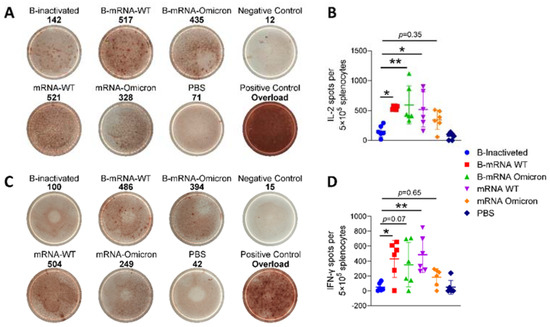 The frequencies of IL-2 and IFN-γ secretion by splenocytes were detected by an ELISPOT assay kit (BD) according to the manufacturer’s protocol. Briefly, splenocytes were seeded in 96-well assay plates precoated with 2 μg/mL antibodies against IL-2 and IFN-γ at a final concentration of 3 × 105 cells/well. Recombinant S-trimer 6P protein at 20 µg/mL was used to stimulate S protein-specific T-cell responses, and the same volume of a solution of PMA+ ionomycin was used as a positive control. Spots were counted with an ELISPOT reader system (Autoimmun Diagnostika GmbH, Strassberg, Germany) after immunoimaging [12].