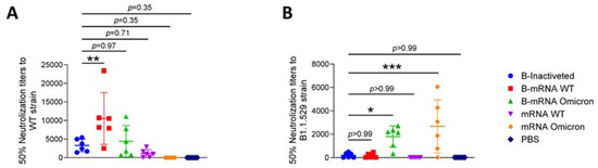 As shown in Figure 1A, after immunization with two doses of inactivated SARS-CoV-2 vaccine, another two doses of prototypic inactivated vaccines or mRNA vaccines encoding the S protein of the WT and B.1.1.529 strains were administered as boosters (abbreviated B), and the groups were designated B-inactivated, B-mRNA WT, and B-mRNA omicron, respectively. Groups that were immunized with two doses of mRNA vaccines for the WT and B.1.1.529 strains with the same schedules but were not primed with two doses of inactivated vaccines were set as the control mRNA vaccine groups (mRNA WT and mRNA omicron groups). Mice immunized with the same volume of PBS were included as the control group.