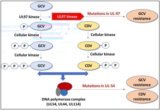 - Wolf, D.G.; Smith, I.L.; Lee, D.J.; Freeman, W.R.; Flores-Aguilar, M.; Spector, S.A. Mutations in human cytomegalovirus UL97 gene confer clinical resistance to ganciclovir and can be detected directly in patient plasma. J. Clin. Investig. 1995, 95, 257–263. [Google Scholar] [CrossRef]