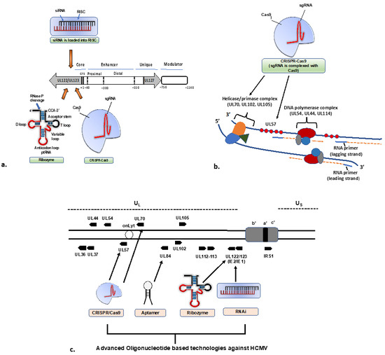Oligonucleotide-based technologies used to target HCMV a. The HCMV major immediate early promoter (MIEP) and enhancer region is a master HCMV IE gene expression regulator. The MIEP contains a promoter region (+1 to −40 bp from the transcriptional start site of IE1/2), an enhancer region (−40 to −500 bp), (a) unique region (−550 to −750 bp) and a modulator (−750 to −1140 bp). siRNA, Ribozymes and CRISPR-Cas9-based technology have been used to target the IE1 and IE2 proteins, the main IE effectors encoded by UL122/UL123 ORF by alternative splicing. (b) HCMV replicates its genome using a viral DNA polymerase complex and a helicase-primase complex. This complex works together concertedly to synthesize both the leading and lagging strand. The helicase-primase complex comprises several subunits, including UL70, UL102 and UL105, whereas the DNA polymerase complex comprises UL54, UL44 and UL114. The UL57 is an essential gene that forms filament on ssDNA to stimulate polymerase and helicase-primase function. CRISPR-Cas9-based technology has been used to target the UL57 and UL70. (c) The schematic illustration shows different genes targeted by oligonucleotide-based approaches.