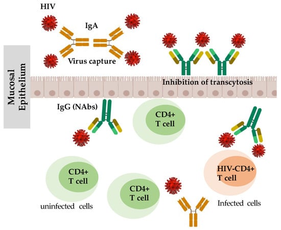 Neutralizing antibodies (NAbs) inhibit HIV infection by binding to HIV envelope proteins, thereby prevents HIV interaction with the cellular receptors that leads to viral entry (Figure 1) [42,43,44,45,46]. Interestingly, Devito et al. [47] found that HIV-1 specific immunoglobulin A (IgA) isolated from the mucosa and plasma of HESN individuals effectively and potently inhibits HIV-1 transcytosis across the mucosal epithelial cells layer, thus demonstrating a crucial mechanism for HIV protection in HESN individuals. Similarly, Hocini and Bomsel [48] also observed that secretory IgA or IgG purified from colostrum obtained from HIV-seropositive women also impairs HIV transcytosis.