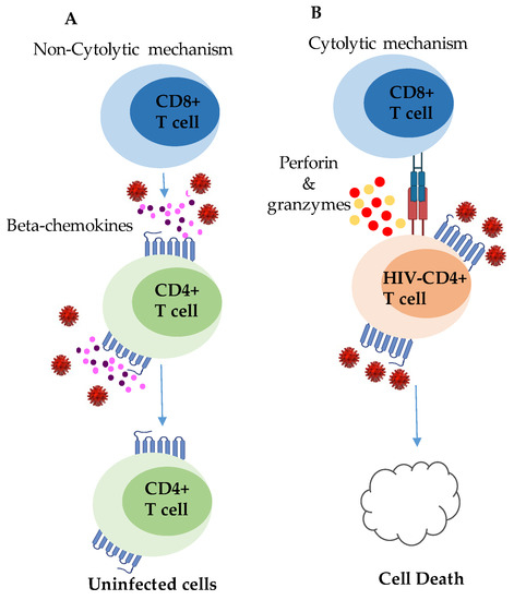 Contribution of CD8+ T cells in preventing HIV infection and replication. (A) Non-cytolytic functions of CD8+ T cells in HIV infection: in response to HIV infection, CD8+ T cells release beta-chemokines that act as protective factors for CD4+ T cells, preventing their infection. (B) Cytolytic functions of CD8+ T cells in HIV infection: when interacting with a CD4+ T cell that is actively producing HIV, CD8+ T cells employ cytolytic mechanisms by releasing perforin and granzyme. This leads to the destruction of the infected cell through the induction of cell death.