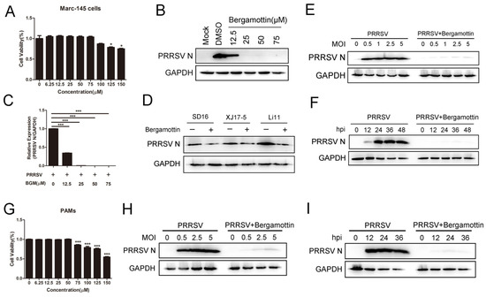 Bergamottin effectively restrained PRRSV replication in both Marc-145 cells and PAMs. (A) The cytotoxicity of bergamottin in Marc-145 cells was measured using a CCK-8 assay. Marc-145 cells were treated with bergamottin at indicated concentrations for 48 h, and cell viability assay was performed. (B) Marc-145 cells were mock-infected or infected with PRRSV (MOI = 1) in the presence of different concentrations of bergamottin (0, 12.5, 25, 50, 75 μM). Viral N protein was detected using western blot. (C) Marc-145 cells were mock-infected or infected with PRRSV (MOI = 1) in the presence of different concentrations of bergamottin (0, 12.5, 25, 50, 75 μM). The mRNA expression of PRRSV N was detected using RT-qPCR. (D) Marc-145 cells were infected with different PRRSV strains (SD16, XJ17-5, and Li11; MOI = 1) in the absence or presence of bergamottin (25 μM); western blot was used to detect the expression of PRRSV N protein. (E) Marc-145 cells were infected with PRRSV at different MOIs in the presence (25 μM) or absence of bergamottin. N protein was determined using western blot analysis. (F) Marc-145 cells were infected PRRSV (MOI = 1) for indicated durations (0, 12, 24, 36, and 48 hpi) in the absence or presence of bergamottin (25 μM). Western blot showed the expression of PRRSV N protein. (G) The cytotoxicity of bergamottin in PAMs was measured using a CCK-8 assay. (H,I) The same treatments were performed in PAMs (bergamottin (25 μM)), and western blot was used to analyze the viral N protein at different MOIs (H) and different infection periods (I). Data are the results of three independent experiments (means ± SE). Significant differences are denoted by * p < 0.05, and *** p < 0.001.