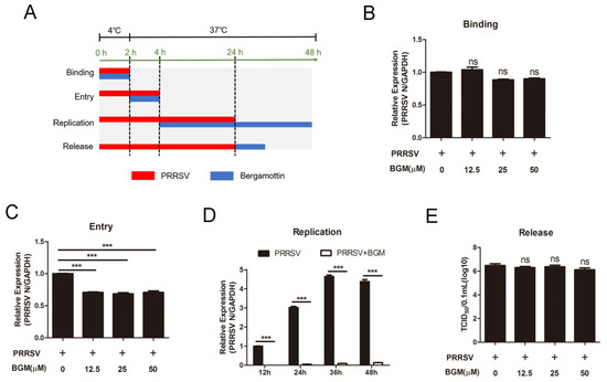 Bergamottin inhibited PRRSV infection at the stage of entry and replication. (A) Schematic diagram of viral attachment, entry, replication, and release. For binding assay, Marc-145 cells were precooled at 4 °C for 1 h and then inoculated with PRRSV (MOI = 5) in the presence or absence of bergamottin for 2 h at 4 °C. For entry assay, after viral binding, cells were washed with cold PBS and treated with bergamottin; then, cells were transferred to 37 °C for another 2 h. For replication assay, cells were infected with PRRSV (MOI = 1) for 4 h and then treated with bergamottin for another 44 h. For release assay, Marc-145 cells were infected with PRRSV (MOI = 1) for 24 h; then, cells were washed with PBS and treated with bergamottin for another 12 h. (B) Viral binding assay was performed, and RT-qPCR was used to detect PRRSV N expression. (C) Viral entry assay was performed; RT-qPCR was used to analyze viral internalization. (D) Viral replication assay was performed; cells were collected at 12, 24, 36, and 48 hpi for RT-qPCR analysis. (E) Viral release assay was performed; cell supernatants were collected for TCID50. Data are the results of three independent experiments (means ± SE). Significant differences are denoted by *** p < 0.001.