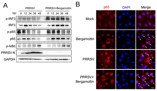 Bergamottin facilitated the activation of IRF3 and NF-κB. (A) Marc-145 cells were infected with PRRSV (MOI = 1) in the presence (25 μM) or absence of bergamottin. Cells were collected at 0, 12, 24, 36, and 48 hpi for western blot analysis. Phosphorylated IRF3, phosphorylated p65, phosphorylated IκBα, total IRF3, and total p65 were detected. GAPDH is shown as an internal reference. (B) Marc-145 were mock-infected or infected with PRRSV (MOI = 1) for 24 h in the presence (25 μM) or absence of bergamottin. Cells were fixed and stained for NF-κB p65 antibody overnight. Then, cells were incubated with an Alexa fluor 555-conjugated anti-rabbit IgG (red). Nuclei were counterstained with DAPI (blue). White arrows represent p65 nuclear translocation. Bar = 25 μm.