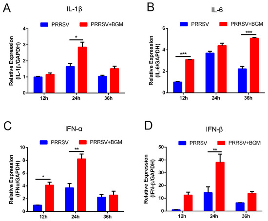 Bergamottin promoted the expression of proinflammatory cytokines and interferon. Marc-145 cells were mock-infected or infected with PRRSV (MOI = 1) in the presence (25 μM) or absence of bergamottin. RT-qPCR was used to measure the mRNA expression of IL-1β (A), IL-6 (B), IFN-α (C), and IFN-β (D) at 12, 24, and 36 hpi. Data are the results of three independent experiments (means ± SE). Significant differences are denoted by * p < 0.05, ** p < 0.01, and *** p < 0.001.