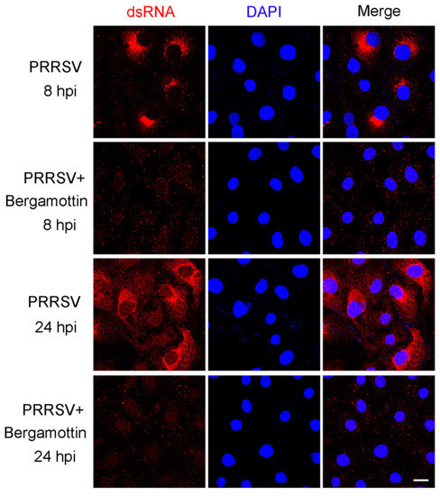 PRRSV is known to produce dsRNA, which accumulates in the cell during the replication cycle [26]. We demonstrated that bergamottin inhibited PRRSV at the stage of replication, then we detected dsRNA expression in the absence or presence of bergamottin during PRRSV replication to identify whether it was due to the blocking of viral RNA synthesis. When Marc-145 cells were infected with PRRSV alone, dsRNA expression was increased at 8 hpi and increased to a maximum at 24 hpi accompanied by viral replication. In contrast, dsRNA production was significantly reduced in bergamottin-treated cells at 8 hpi, and it remained low up to 24 h after infection, which indicated bergamottin inhibited PRRSV replication in the early stage of replication by intercepting viral dsRNA formation (Figure 5). Collectively, bergamottin suppressed PRRSV RNA synthesis, thus inhibiting the PRRSV replication cycle.