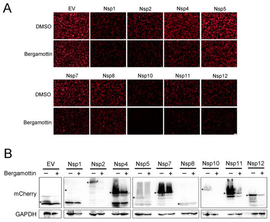 Bergamottin inhibited the expression of viral Nsps. mCherry-tagged viral Nsp plasmids (Nsp1, Nsp2, Nsp4, Nsp5, Nsp7, Nsp8, Nsp10, Nsp11, and Nsp12) were transfected into HEK293T cells for 6 h, respectively. Then, cells were treated with bergamottin (25 μM) for another 24 h. (A) Immunofluorescence analysis of Nsps-mCherry expression (Red); Bar = 200 μm. (B) Western blot analysis of Nsps-mCherry expression using anti-mCherry antibody, Asterisks mark the expressed mCherry-fusion proteins of viral Nsps.