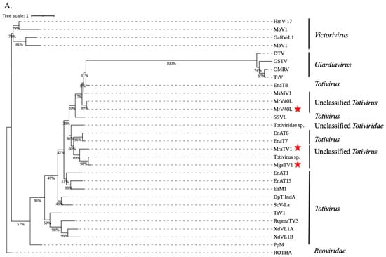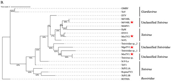 To study the evolutionary relationships between candidate ORFs and mycoviruses from the Totivirus, Giardiavirus, Victorivirus and unclassified Totivirus genera, we used maximum-likelihood phylogenetic analyses of the RdRP and CP amino acid sequences (Supplementary Table S5). Based on genomic features, i.e., on the non-segmented organisation of their genome and the apparent structural similarity between the different ORFs and the proteins of the ScV-L-A species (the prototype virus of the genus Totivirus), we assumed that these candidate viruses belong to the Totiviridae family. Phylogenetic analysis performed using RdRps sequences showed a clustering of the newly found MgaTV1 and MraTV1 with mycoviruses of unclassified Totivirus and Totivirus genus. The MrV40L identified in this study was clustered with the previously described MrV40L by Park et al. as expected (Figure 2A). Moreover, phylogenetic analysis of the CP sequences obtained from RNA-seq confirmed that the Mrv40L was also phylogenetically similar to the previously identified MrV40L [4]. However, the newly putative CP found MgaTV1, MraTV1, and MraTV2 cluster within members of unclassified Totiviridae, unclassified Totivirus and the genus Totivirus, respectively (Figure 2B).