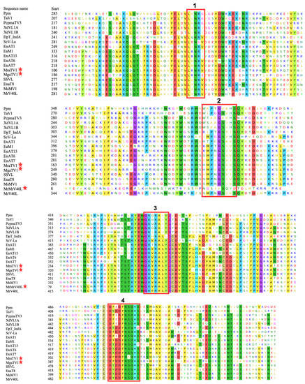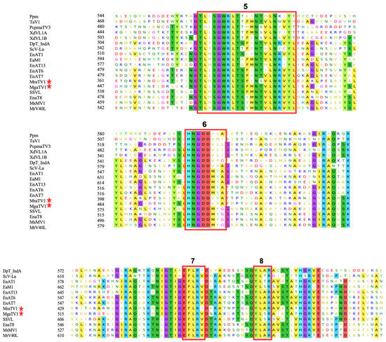 To confirm the presence of functionally conserved motifs of RdRp and CP in candidate viruses, we further analysed and compared eight RdRp motifs which are commonly found in totiviruses [28]. The eight conserved motifs were found within RdRP of the newly found MgaTV1 and MraTV1, supporting their classification as a Totivirus, whereas only two of these motifs were observed in MrV40L, owing to the reduced size of the candidate sequence (Figure 3). In addition, an alignment of the sequences of CP with their closest homologues using the MEME suite [23] revealed the existence of eight conserved motifs in most CP of the analysed species (Figure S1).