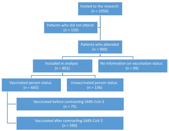 In total, 1050 patients were enrolled for the follow-up visit in the 12th month, of which 150 did not attend. Of the data obtained from 900 patients, 99 did not provide or did not consent to the disclosure of information regarding the status of vaccination against COVID-19. Therefore, 801 patients were included in the final analysis, of which 665 (83.0%) were vaccinated. Analysis of the date of vaccination against the first COVID-19 infection indicated that 75 people (9.4%) were vaccinated before the disease and 590 (73.6%) after infection with SARS-CoV-2. The characteristics of the study group are presented in Figure 1. The vaccination status of the study group is summarized in Table 1.