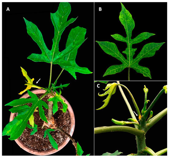 Symptomatic babaco (Vasconcellea × heilbornii) plant subjected to this study. (A) Leaf mosaic and yellowing (arrow). (B) Detached leaf with vein banding and mosaic. (C) Yellowing (arrow) at the petiole base of a leaf with premature abscission. Pictures correspond to the same plant at different times.
