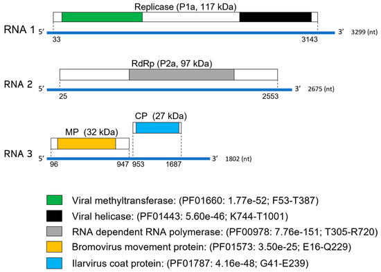 Genome organization of babaco ilarvirus-1. Genome positions of predicted open reading frames (ORFs) in each RNA segment are indicated with dotted lines. Conserved domains and molecular weight (in kDa) of the putative replicase, RNA-dependent-RNA-polymerase (RdRp), movement protein (MP), and coat protein (CP), respectively, are shown in different colors.