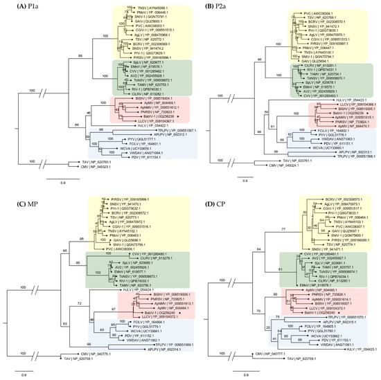 Phylogenetic analysis of babaco ilarvirus-1 (BabIV-1, GenBank accessions: OQ256238, OQ256239, OQ256240) and other ilarviruses based on amino acid sequences of the four proteins, P1a (A), P2a (B), movement protein (MP) (C) and coat protein (CP) (D). Colored shading denotes different clades which are consistent regardless of the protein analyzed. The analysis was performed on CIPRES with 1000 bootstraps. Bootstrap values are indicated at each node. Virus abbreviations, names and accession numbers are listed in Supplementary Table S4. Tomato aspermy virus (TAV) and Cucumber mosaic virus (CMV) were used as outgroups. Scale bar represents aminoacids substitution per site. BabIV-1 is marked with an asterisk.