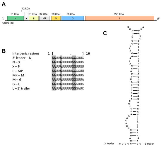 Genomic organization of babaco rhabdovirus-1 (BabRV-1). (A) Schematic representation of its predicted open reading frames (ORFs: nucleocapsid (N), protein X (X), phosphoprotein (P), movement protein (MP), matrix (M), glycoprotein (G), polymerase (L)). (B) Alignment of intergenic regions observed in BabRV-1 genome. (C) Partial genome complementarity of 3′ leader and 5′ trailer terminal sequences.