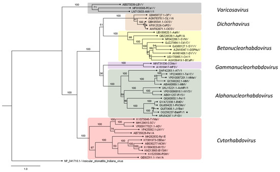 - Walker, P.J.; Freitas-Astúa, J.; Bejerman, N.; Blasdell, K.R.; Dietzgen, R.G.; Fooks, A.R.; Kondo, H.; Kurath, G.; Ramos-González, P.L.; Shi, M.; et al. ICTV Virus Taxonomy Profile: Rhabdoviridae. J. Gen. Virol. 2022, 103, 001689. [Google Scholar] [CrossRef]