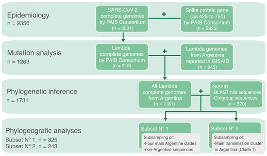 To study the introductions and diversification of Lambda in Argentina, a phylogenetic analysis was conducted with the 1263 genome sequences of the Lambda variant from Argentina, along with their most similar sequences (the best ten hits for each sequence) from a BLAST analysis conducted against the GISAID database (accessed on 30 April 2022), plus reference sequences from other lineages as outgroup. Sequences <29 Kb were excluded, except for isolates with 27–29 Kb in length that were kept due to the scarce genomic data available from some regions. The final dataset included 1731 sequences, with 1688 Lambda sequences.