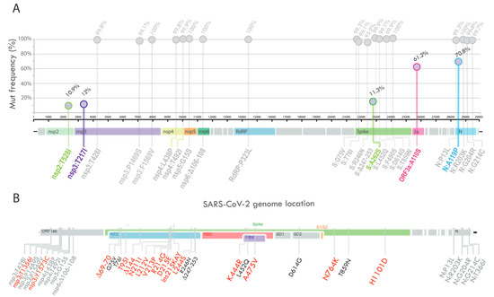Compared to the reference sequence hCoV-19/Wuhan/WIV04/2019 (GISAID accession number EPI_ISL_402124), the 1263 genome sequences displayed a total of 1631 amino acid changes in different viral genes (912 in ORF1a/1b, 268 in S, 121 in N, 114 in ORF3a, 94 in ORF7a, 47 in ORF8, 28 in M, 18 in ORF6, 17 in ORF7b, and 12 in E). In the Argentine sequences, all the C.37 lineage defining amino acid changes [41], shown in grey in Figure 4A, were found at a frequency higher than 95.9%.