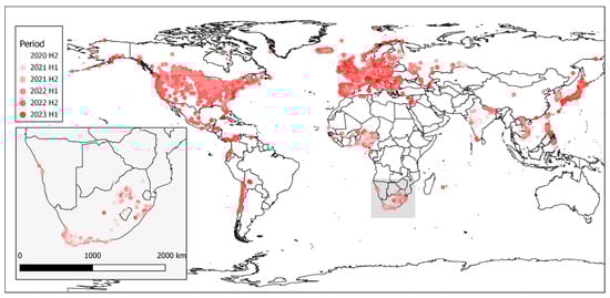 Map of all H5N1 outbreaks reported between July 2020 (2020 H2) and February 2023 (2023 H1) to the WOAH. Outbreak color reflects the half-year period from 2020 H1 through 2023 H1 [6 periods].