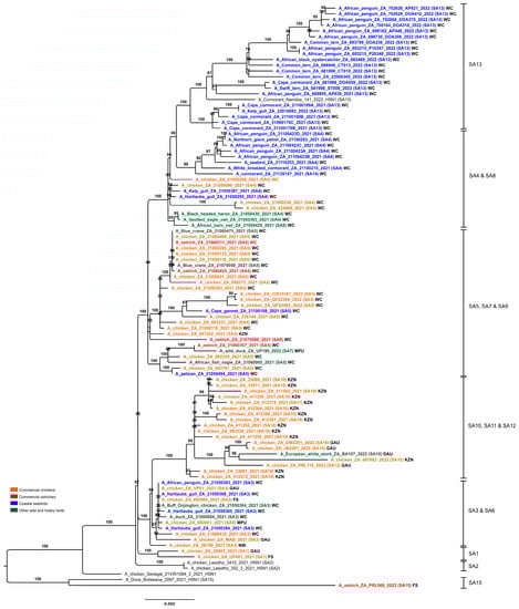 Other sub-genotype SA5 viruses in the Western Cape that caused chicken outbreaks grouped most closely with wild bird viruses. Indeed, 693781/2021 caused an outbreak in 14-week-old layers near Malmesbury on 27 May, and its closest relative was detected in a dead pelican (21050494/2021) found two days later in the same area, and 692329/2021, from an outbreak near Grabouw in mid-May, shared a most recent common ancestor with an African fish eagle virus (21060065/2021) diagnosed in a weak bird found near Bredasdorp at the end of June. Later on, 21060435/2021 was associated with an outbreak causing 100% mortality in backyard chickens in Phillipi, Cape Town on 24 June, but this is an SA3 strain. Next, 21050299/2021, the cause of the 18 May outbreak near Piketberg, an SA4-type virus, was genetically distinct from all other chicken outbreaks in the Western Cape at the time and shared ancestry with what would eventually emerge as the SA13 coastal seabird-specific lineage that is discussed in the next section. Viruses from outbreaks in other provinces were also genetically distinct, and therefore point introductions into those operations. Examples include UP481/2021 (SA1, broiler outbreak in Villiers, Free State province on 10 May) and MAB/2021 (SA3, Rietvlei near Pretoria, Gauteng province on 27 August).