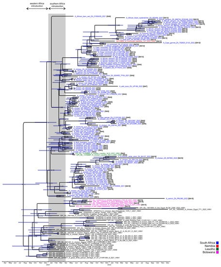 Maximum clade credibility tree of the H5 HA gene of clade 2.3.4.4B H5N1 HPAI viruses from southern Africa in 2021–2022 and the closest relatives. The nodes values represent the posterior probability and the bars represent the 95% highest posterior probability range. Square brackets denote the regional sub-genotypes assigned in this study, where these are italicized, the sub-genotype was inferred from a partial genome. The grey bar highlights the period between early January and April 2021 when the progenitors to the H5N1 HPAI viruses causing the southern African outbreaks emerged and spread southwards.