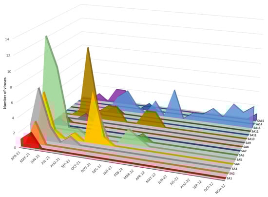 Temporal distribution of sub-genotypes SA1–SA15 detected in southern African clade 2.3.4.4B H5N1 HPAI outbreaks in 2021–2022.