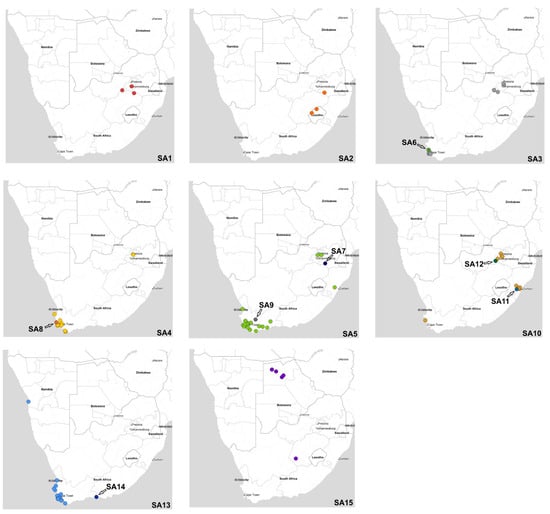 Geographic locations of clade 2.3.4.4B H5N1 HPAI sub-genotypes in southern Africa in 2021–2022. Sub-genotypes represented by a single strain are grouped with the closely related sub-genotype (SA3 and SA6), (SA4 and SA8), (SA5, SA7 and SA9), (SA10, SA11 and SA12) and (SA13 and SA14).