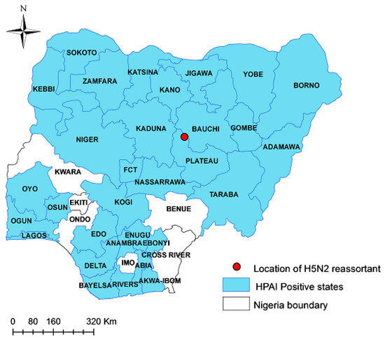 More specifically, 454 A(H5N1), 12 A(H5N8), and 1 A(H5N2) outbreaks were reported from the total of the 467 outbreaks reported in the country. It is of note that the unique A (H5N2) subtype was identified in a tissue sample collected from a mixed-species poultry flock of 20,792 birds (8271 ducks and 12,521 layer chickens) in Toro LGA of Bauchi State, northeastern Nigeria (Longitude:10.056813 and Latitude:09.0685465) (Figure 1), where a sudden increase in mortality was registered (2000 birds within 24 h).